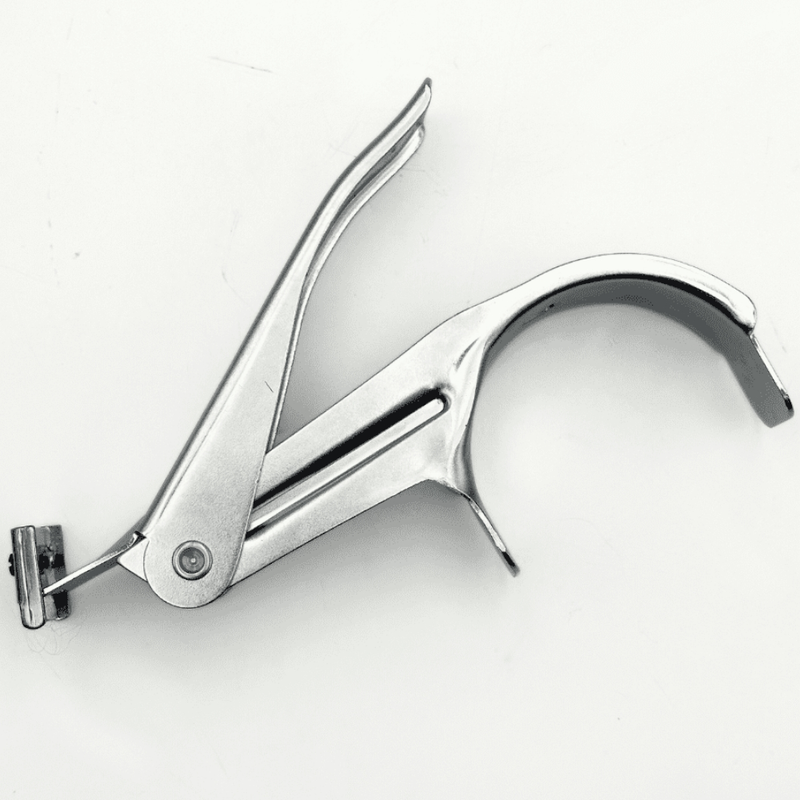 This Hand Strapper / Filament Tape Dispenser is an all-metal nickel plated dispenser with hand squeeze tensioner, a swing-out tape holder and a fine blade.