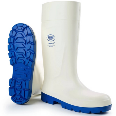 Bekina's White/Blue Steplite EasyGrip PU Gumboot is a Belgian made safety gumboot.