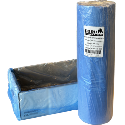 Our own GORILLA 'Standard' Food-grade virgin HDPE Blue Carton Liners (perforated on roll) are suitable for lining cartons holding contents like fresh fruit, meats, medical substances and other goods.