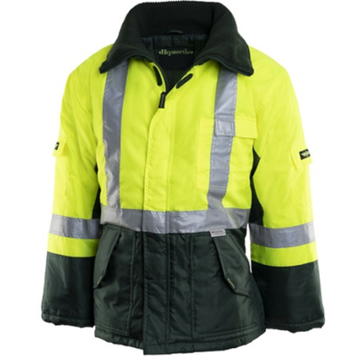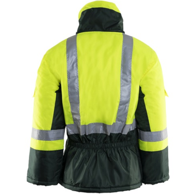 These Forest Green Jackets with Hi Vis Yellow panels are tailored to meet the specific needs of workers exposed to freezing temperatures, ensuring they remain warm, safe, and productive.