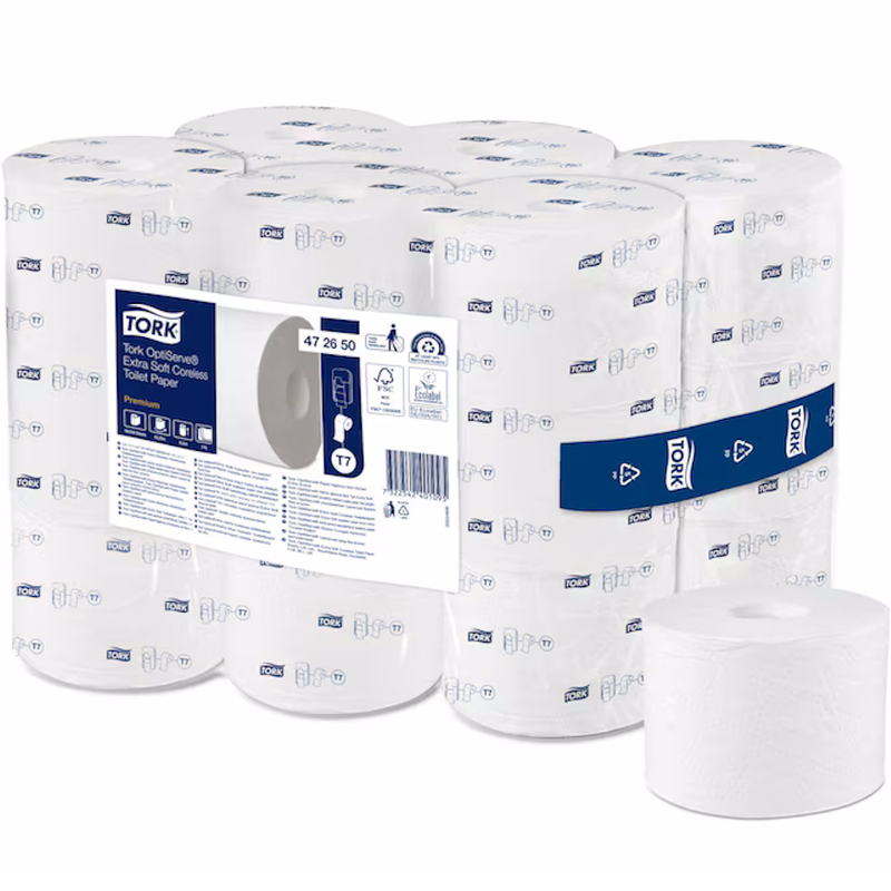 Tork's 472650 T7 System Premium OptiServe Extra Soft Coreless Toilet Paper Rolls is an efficient system ideal for low to medium-traffic washrooms with high focus on guest satisfaction.